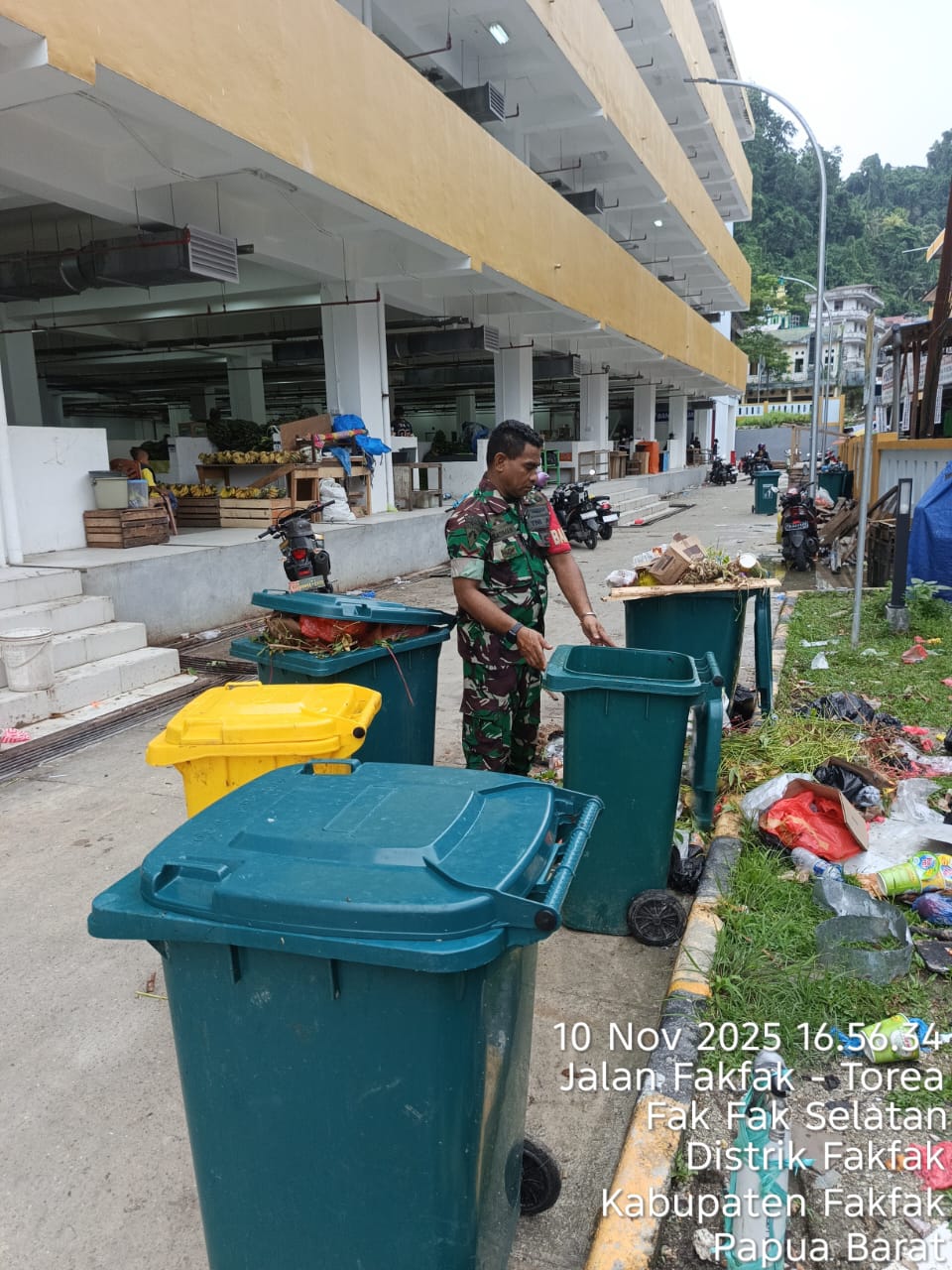 Babinsa Koramil 1803-01/Fakfak itu bergabung dengan koordinator kebersihan, Jailani Patiran, untuk memastikan setiap sudut pasar tetap bersih dan bebas dari timbunan sampah.