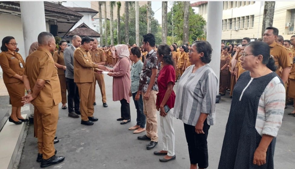 Penyerahan secara simbolis dilakukan WaliKota, Bodewin M. Wattimena, Wakil WaliKota, Ely Toisutta, Sekkot, Roby Sapulette, Plt. Kadis Koperasi Vebyana Siegers, dan Deputy Brands Manager Bank Tabungan Negara (BTN), Herry Gerald Talupun, saat apel pagi, Senin (28/7/2025), di Balai Kota.