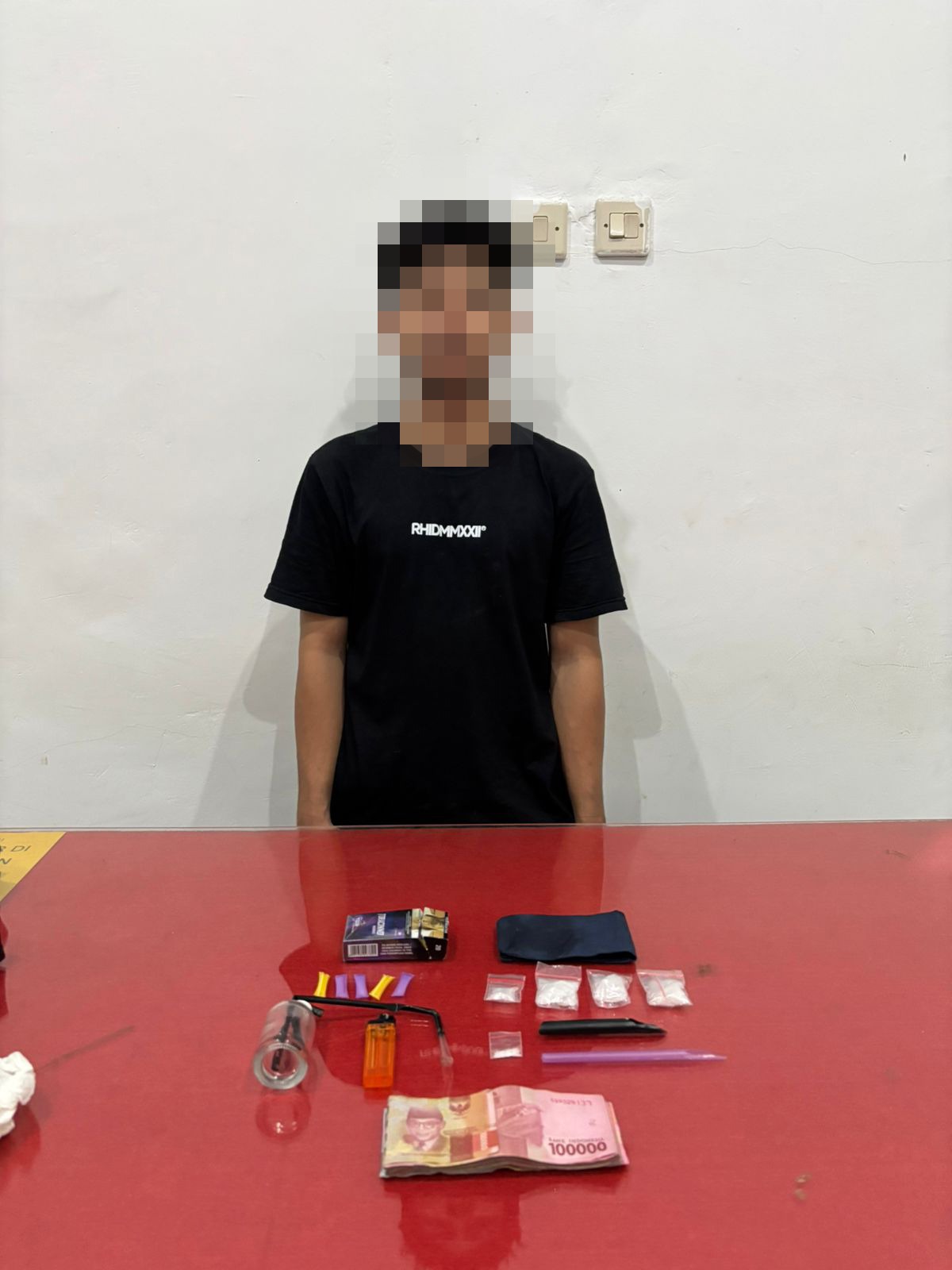 “Disaksikan oleh perangkat RT setempat, kami mengamankan pelaku RF serta sejumlah barang bukti berupa 10 kantong klip transparan berisi serbuk kristal diduga narkotika jenis sabu dengan berat total 17,81 gram brutto, 1 buah alat hisap sabu bong, 2 buah pipet modifikasi sendok sabu, 1 buah Handphone, 1 unit sepeda motor merk Vario serta Uang tunai 3.570.000 rupiah ” Tambah Aris.