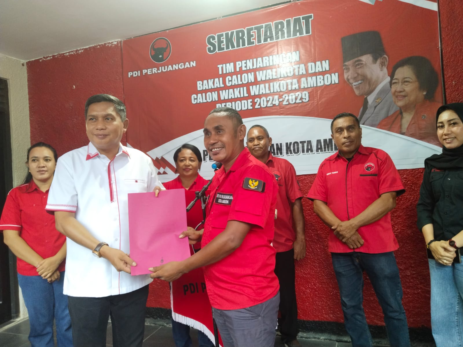 Ambon, Kabarsulsel-Indonesia.com | Pejabat Walikota Ambon Bodewin Wattimena mengembalikan formulir sekaligus mendaftarkan diri sebagai Bakal Calon Walikota Ambon Periode 2024-2029, dikantor Sekretariat DPC Partai Demokrasi Indonesia Perjuangan (PDI-P) Mangga Dua Kota Ambon, Selasa 30/4/2024.