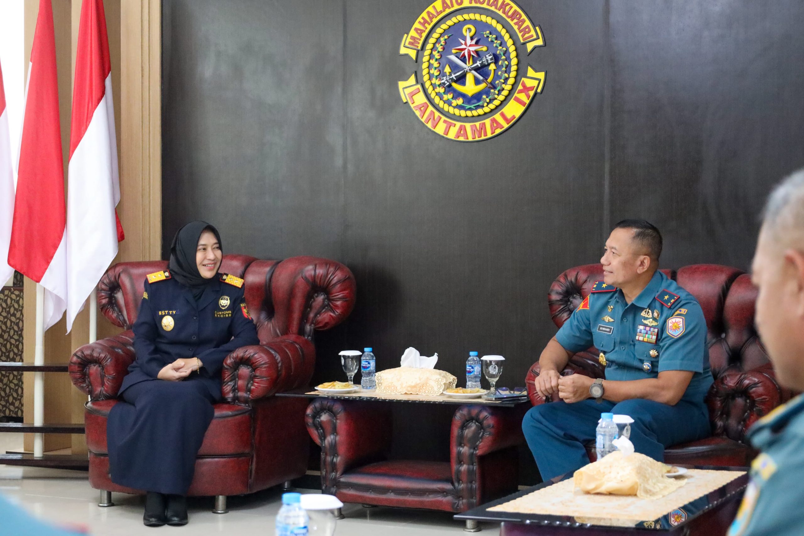 Brigjen TNI (Mar) Suwandi didampingi Aslog Danlantamal IX, Danpomal Lantamal IX, Danyonmarhanlan IX dan Dantim Intel Lantamal IX menerima kunjungan dari Kepala Kantor Bea dan Cukai bersama tim. Rombongan Bea Cukai yang dipimpin oleh Ibu Essty Purwadiani Hidayatie, S.Si., M.Si., Ph.D., selaku Kepala Kantor Wilayah Bea Cukai bersama tim yaitu Kepala Bidang Penindakan dan Penyidikan, Kepala Seksi Intelijen dan Kepala Seksi Penindakan I melaksanakan kunjungan silaturahmi ke Lantamal IX Ambon.