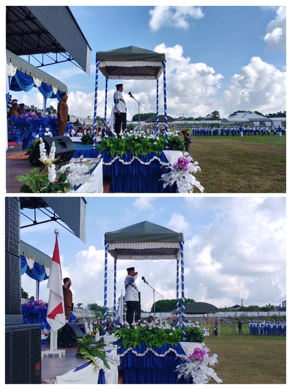 “Guru itu digugu dan ditiru. Tunjukkan contoh terbaik di hadapan siswa,” kata Bupati disambut tepuk tangan peserta upacara.