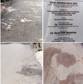 Diduga CV.JELAI KURI SERANTAU mengurangi volume dari bistik yang ada sehingga merusak Proyek yang ada di dusun segagap desa Tayap kecamatan nanga Tayap Kabupaten Ketapang Kalimantan Barat