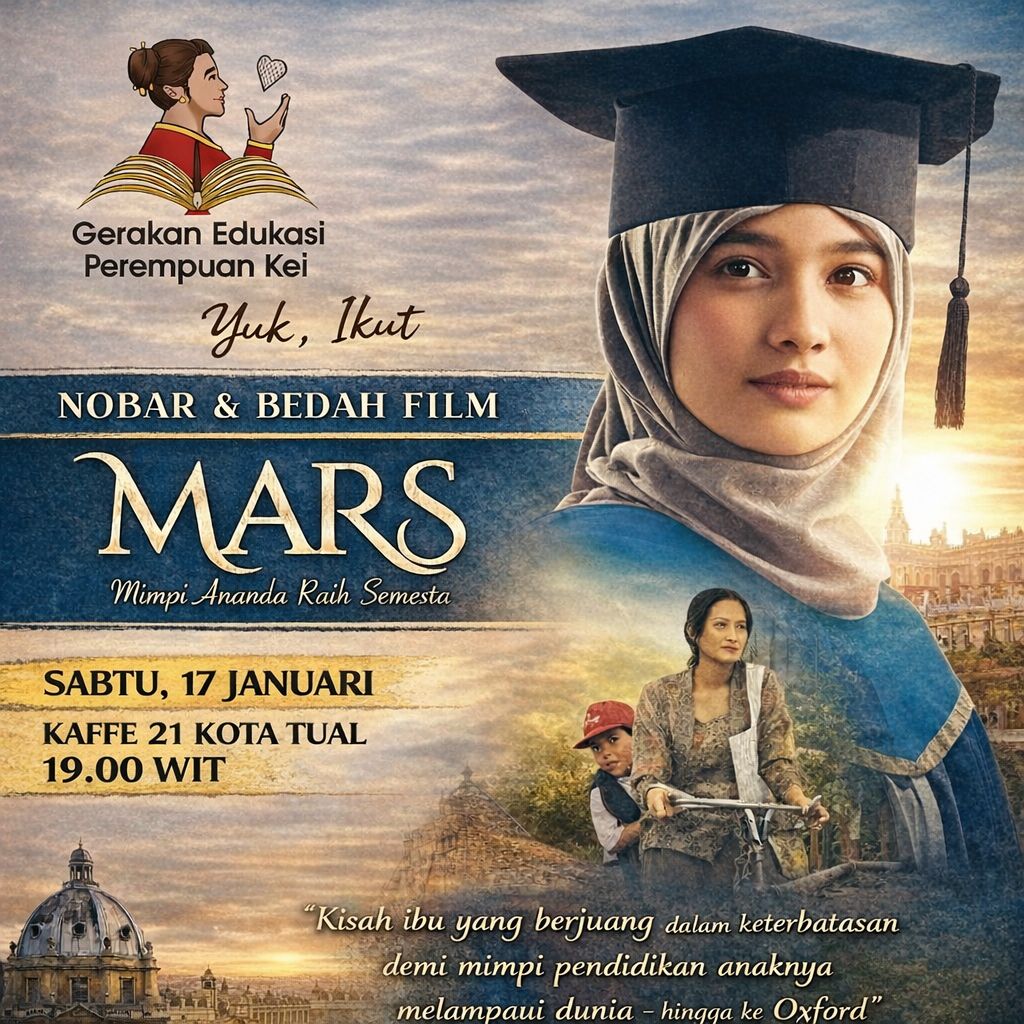 Tual,Kabarsulsel-Indonesia.com. Gerakan Edukasi Perempuan Kei menggelar kegiatan Nonton Bareng (Nobar) dan Bedah Film “MARS: Mimpi Ananda Raih Semesta” pada Sabtu, 17 Januari, bertempat di Kaffe 21 Kota Tual, mulai pukul 19.00 WIT.