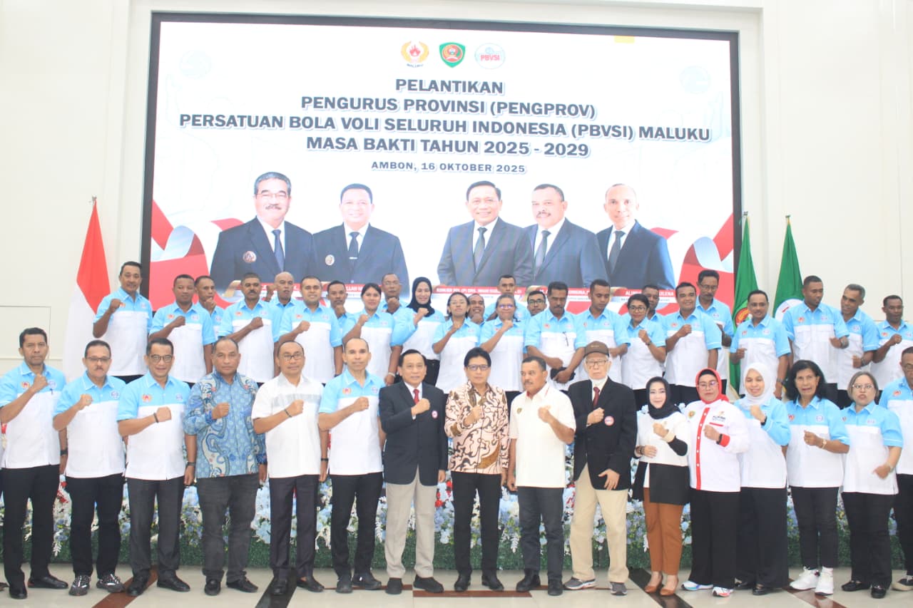 Ambon,Kabarsulsel-lndonesia.com. Pengurus Provinsi (Pengprov) Persatuan Bola Voli Seluruh Indonesia (PBVSI) Maluku Masa Bhakti 2025-2029 resmi dilantik oleh Ketua Umum Pengurus Pusat PBVSI, Komjen Pol. (Purn) Dr. Imam Sudjarwo, M.Si., pada Kamis (16/10/2025) malam.
