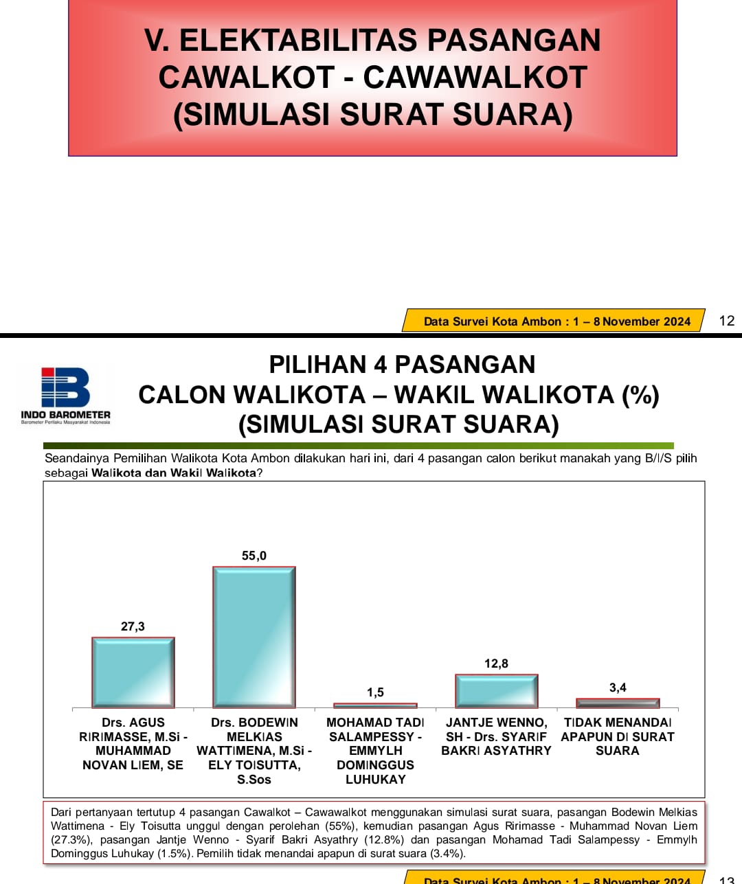 Berdasarkan data survei Indo Barometer per tanggal 1-8 November 2024, Yang menggunakan simulasi surat suara, pasangan Bodewin Melkias Wattimena – Ely Toisuta unggul dengan perolehan 55 persen,” Ujar Devisi Riseet Indo Barometer Christopher Nugroho, Senin 18/11/2024.