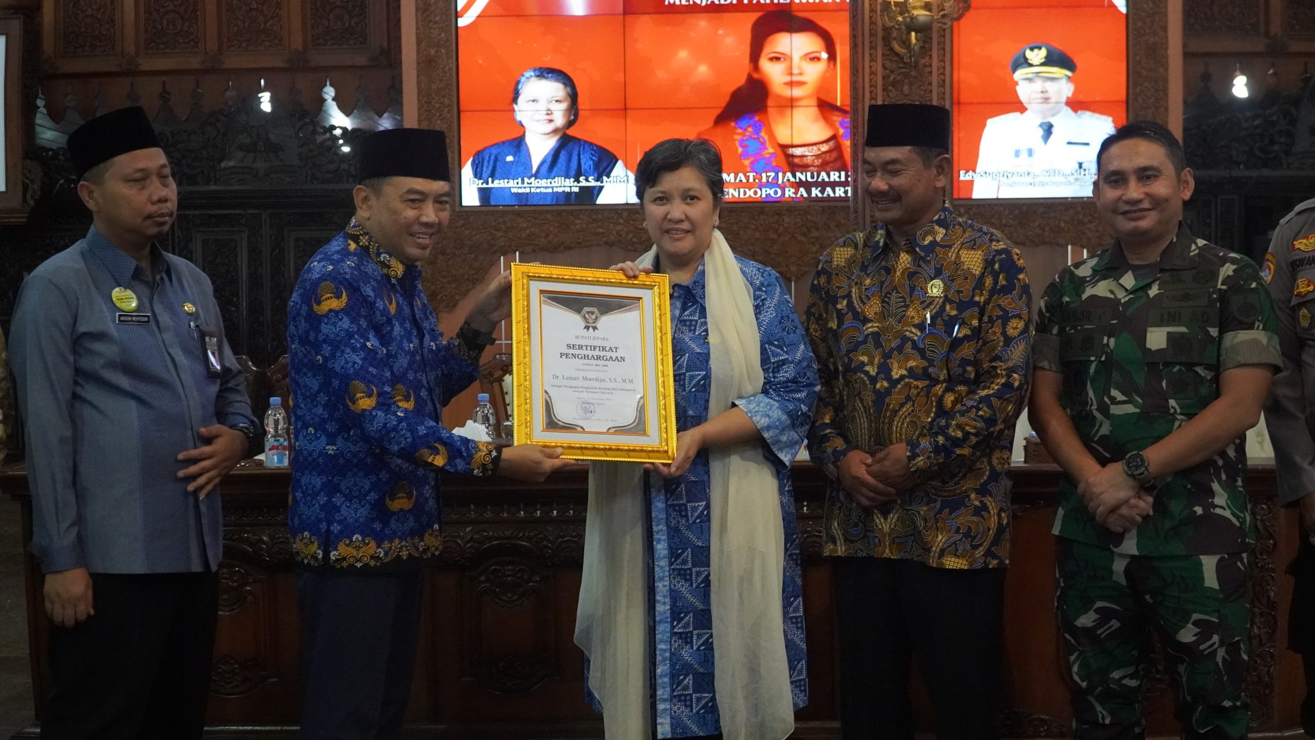 JEPARA – Penjabat Bupati Jepara Edy Supriyanta menyerahkan penghargaan kepada Wakil Ketua MPR RI Lestari Moerdijat. Mbak Rerie, sapaan akrab Lestari Moerdijat diberikan penghargaan oleh Pemkab Jepara karena perannya sebagai penggagas pengusulan Ratu Kalinyamat menjadi pahlawan nasional. Penyerahan ini dilakukan di Pendapa RA. Kartini Jepara pada Jumat (17/1/2025).