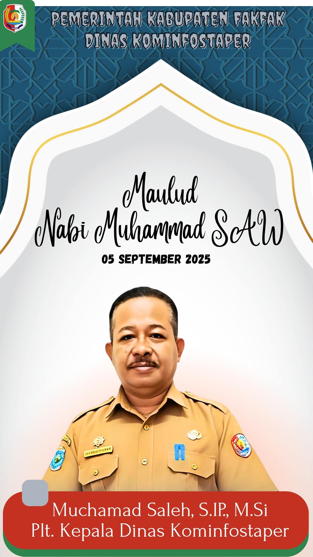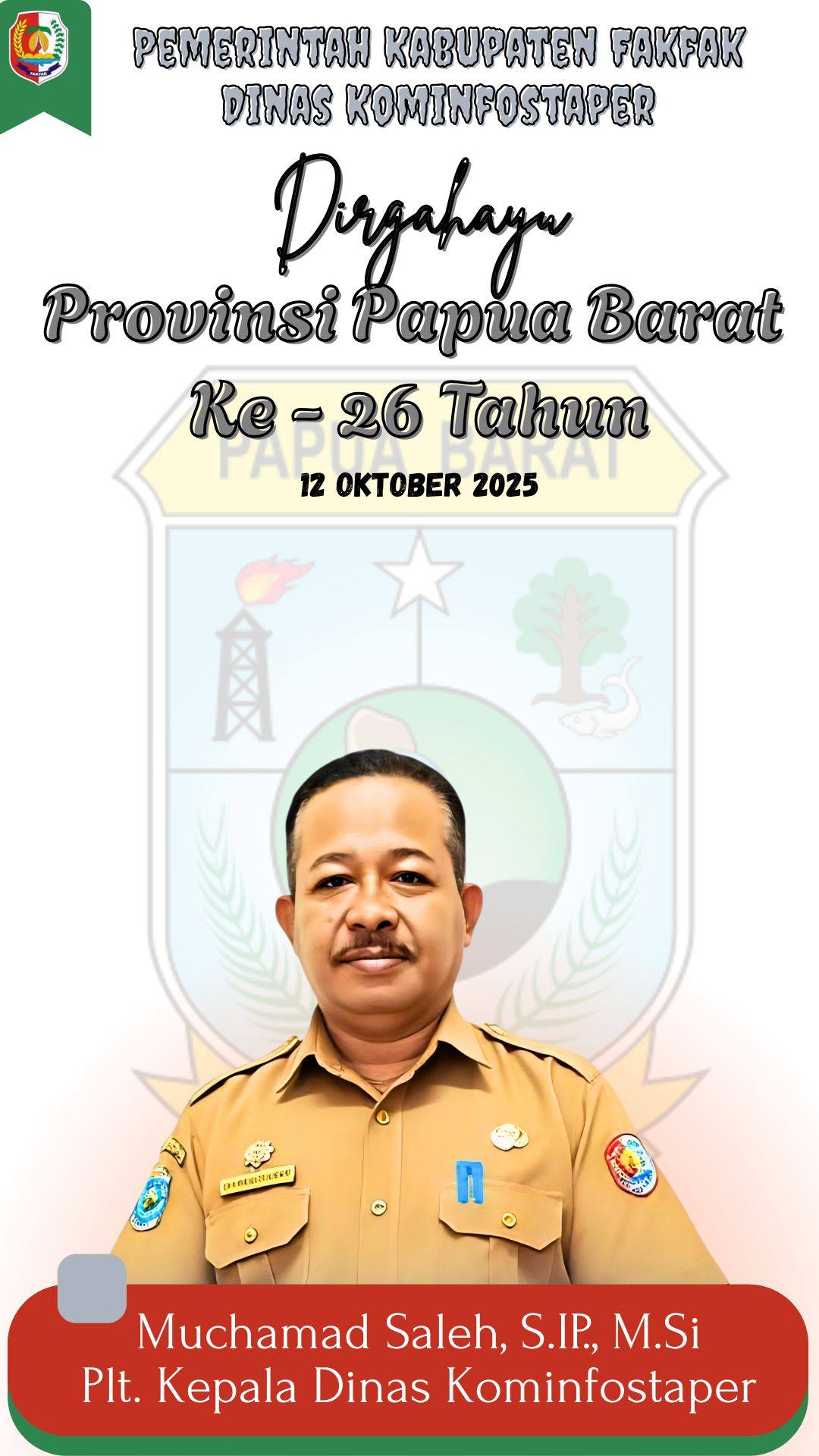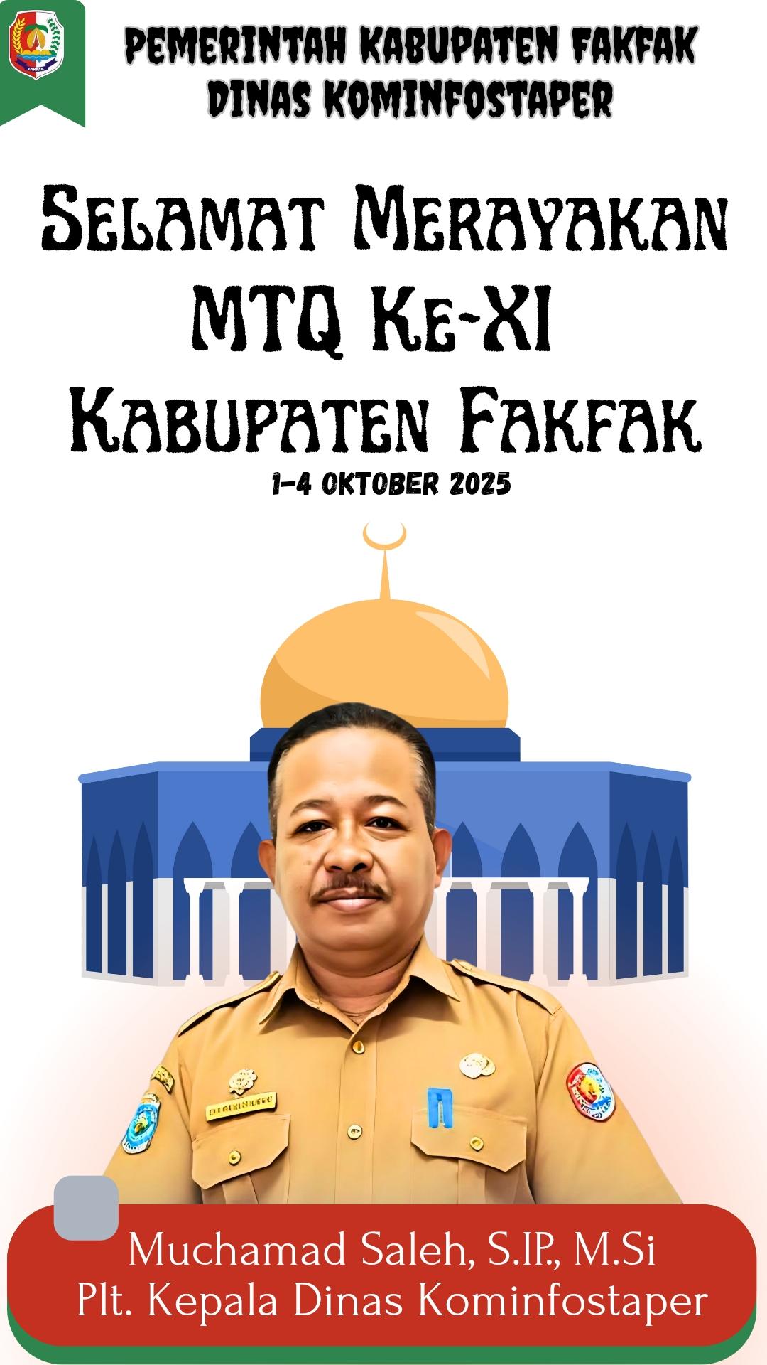 Plt. Kepala Dinas Komunikasi, Informasi, Statistik dan Persandian Kabupaten Fakfak [Mochamad Saleh, S.IP., M.SI] Mengucapkan Selamat Merayakan MTQ Ke-XI Kabupaten Fakfak. (1-4 Oktober 2025)Plt. Kepala Dinas Komunikasi, Informasi, Statistik dan Persandian Kabupaten Fakfak [Mochamad Saleh, S.IP., M.SI] Mengucapkan Selamat Merayakan Sumpah Pemuda ke 97 Tahun (28 Oktober 2025)Plt. Kepala Dinas Komunikasi, Informasi, Statistik dan Persandian Kabupaten Fakfak [Mochamad Saleh, S.IP., M.SI] Mengucapkan Dirgahayu Provinsi Papua Barat Ke-26 Tahun (12 Oktober 2025)Plt. Kepala Dinas Komunikasi, Informasi, Statistik dan Persandian Kabupaten Fakfak [Mochamad Saleh, S.IP., M.SI] Mengucapkan Selamat Hari Perhubungan Nasional “17 September 2025”Plt. Kepala Dinas Komunikasi, Informasi, Statistik dan Persandian Kabupaten Fakfak [Mochamad Saleh, S.IP., M.SI] Mengucapkan Selamat Hari Olah Raga Nasional. (09 September 2025)Plt. Kepala Dinas Komunikasi, Informasi, Statistik dan Persandian Kabupaten Fakfak [Mochamad Saleh, S.IP., M.SI] Mengucapkan Selamat Merayakan Maulud Nabi Muhammad SAW. (05 September 2025)