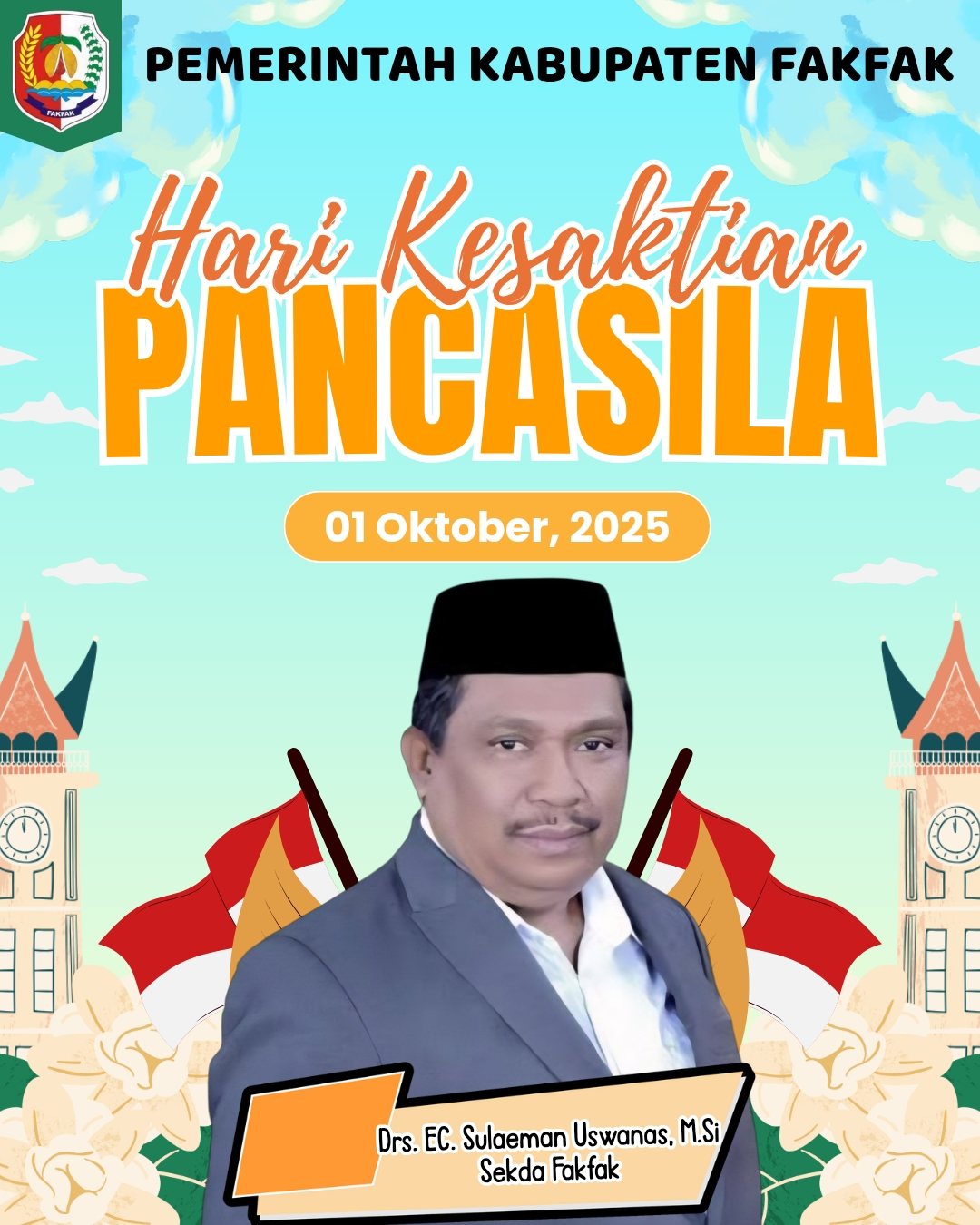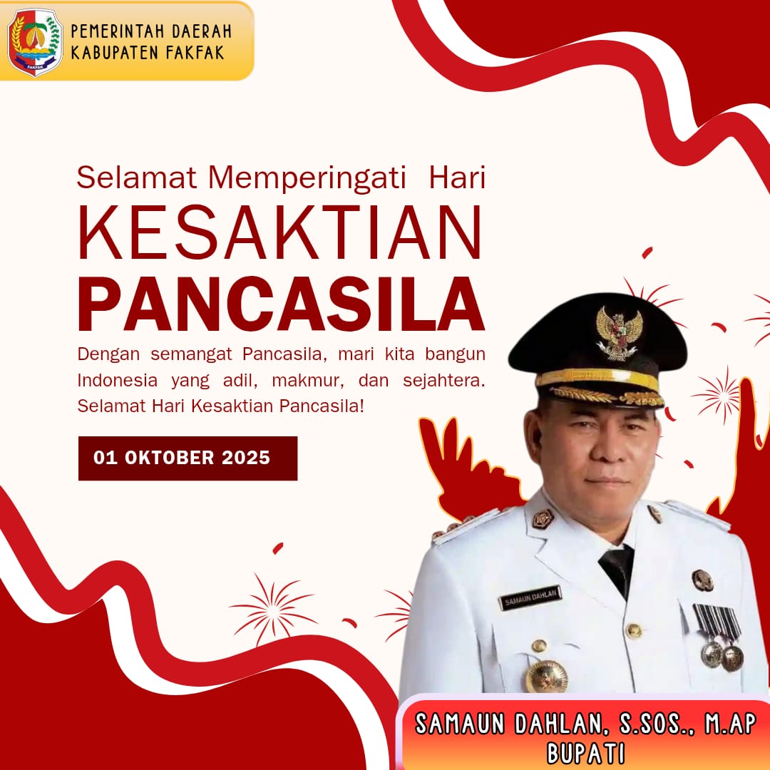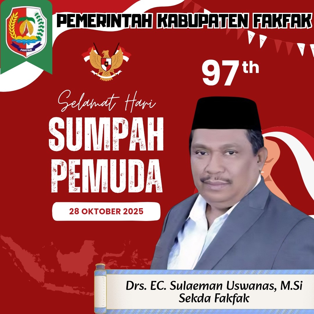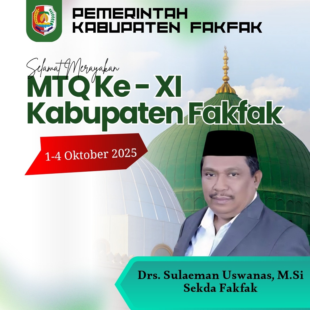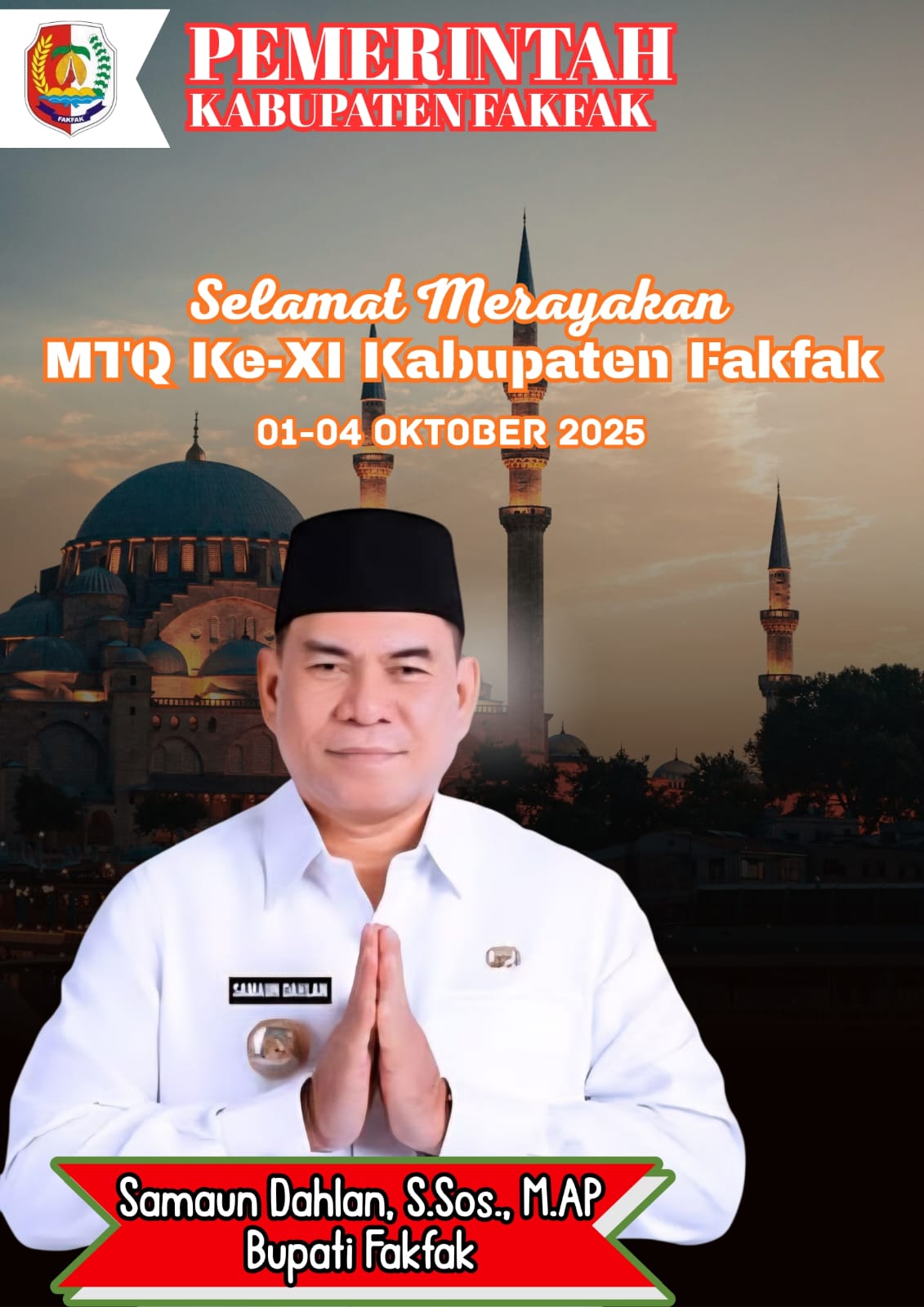 Bupati Kabupaten Fakfak Samaun Dahlan, S.Sos., M.AP Mengucapkan Selamat Merayakan Hari Sumpah Pemuda (28 Oktober 2025)Bupati Kabupaten Fakfak Samaun Dahlan, S.Sos., M.AP Mengucapkan Selamat Merayakan MTQ Ke-XI Kabupaten Fakfak di Kampung Kotam Distrik Fakfak Timur Tengah (01-04 Oktober 2025)Bupati Kabupaten Fakfak Samaun Dahlan, S.Sos., M.AP Mengucapkan Dirgahayu Ke-75 Tahun Ikatan Dokter Indonesia (24 Oktober 2025)Bupati Kabupaten Fakfak Samaun Dahlan, S.Sos., M.AP Mengucapkan Dirgahayu Tentara Nasional Indonesia (05 Oktober 2025)Bupati Kabupaten Fakfak Samaun Dahlan, S.Sos., M.AP Mengucapkan Selamat Hari Kesaktian Pancasila (01 Oktober 2025)Bupati Kabupaten Fakfak Samaun Dahlan, S.Sos., M.AP Mengucapkan Selamat Hari Perhubungan Nasional (17 September 2025)Bupati Kabupaten Fakfak Samaun Dahlan, S.Sos., M.AP Mengucapkan Selamat Hari Olah Raga Nasional (09 September 2025)Bupati Kabupaten Fakfak Samaun Dahlan, S.Sos., M.AP Mengucapkan Selamat Merayakan Maulud Nabi Muhammad SAW 1446 H/2025 Masehi.Wakil Bupati Fakfak Drs. Donatus Nimbitkendik, M.TP Mengucapkan Selamat Merayakan MTQ Ke-XI Kabupaten Fakfak di Kampung Kotam Distrik Fakfak Timur Tengah (01-04 Oktober 2025)Wakil Bupati Fakfak Drs. Donatus Nimbitkendik, M.TP Mengucapkan Selamat Merayakan Hari Sumpah Pemuda Ke-97 Tahun (28 Oktober 2025)Wakil Bupati Fakfak Drs. Donatus Nimbitkendik, M.TP Mengucapkan Dirgahayu Provinsi Papua Barat Ke-26 Tahun (12 Oktober 2025)Wakil Bupati Fakfak Drs. Donatus Nimbitkendik, M.TP Mengucapkan Dirgahayu Tentara Nasional Indonesia Ke- 80 Tahun (05 Oktober 2025)Wakil Bupati Fakfak Drs. Donatus Nimbitkendik, M.TP Mengucapkan Selamat Hari Kesaktian Pancasila (01 Oktober 2025)Wakil Bupati Fakfak Drs. Donatus Nimbitkendik, M.TP Mengucapkan Selamat Hari Perhubungan Nasional (17 September 2025)Wakil Bupati Fakfak Drs. Donatus Nimbitkendik, M.TP Mengucapkan Selamat Hari Olah Raga Nasional (09 September 2025)Wakil Bupati Fakfak Drs. Donatus Nimbitkendik, M.TP Mengucapkan Selamat Memperingati Maulud Nabi Muhammad SAW 1447 H.Sekretaris Daerah Kabupaten Fakfak (Drs. EC. Sulaeman Uswanas, M.Si) Mengucapkan Selamat Merayakan MTQ Ke-XI Kabupaten Fakfak Di Kampung Kotam Distrik Fakfak Timur Tengah (01-04 Oktober 2025)Sekretaris Daerah Kabupaten Fakfak (Drs. EC. Sulaeman Uswanas, M.Si) Mengucapkan Selamat Hari Sumpah Pemuda (28 Oktober 2025)Sekretaris Daerah Kabupaten Fakfak (Drs. EC. Sulaeman Uswanas, M.Si) Mengucapkan Dirgahayu Provinsi Papua Barat Ke – 26 Tahun (12 Oktober 2025)Sekretaris Daerah Kabupaten Fakfak (Drs. EC. Sulaeman Uswanas, M.Si) Mengucapkan Dirgahayu TNI Ke-80 Tahun (05 Oktober 2025)Sekretaris Daerah Kabupaten Fakfak (Drs. EC. Sulaeman Uswanas, M.Si) Mengucapkan Selamat Memperingati Hari Kesaktian Pancasila (1 Oktober 2025)Sekretaris Daerah Kabupaten Fakfak (Drs. EC. Sulaeman Uswanas, M.Si) Mengucapkan Selamat Hari Perhubungan Nasional (17 September 2025)Sekretaris Daerah Kabupaten Fakfak (Drs. EC. Sulaeman Uswanas, M.Si) Mengucapkan Selamat Hari Olah Raga Nasional (09 September 2025)Sekretaris Daerah Kabupaten Fakfak (Drs. EC. Sulaeman Uswanas, M.Si) Mengucapkan Selamat Merayakan Maulud Nabi Muhammad SAW 1447 H.