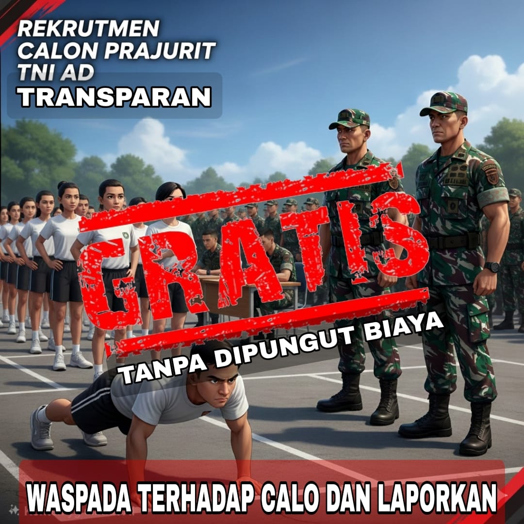 Dalam setiap kesempatan rekrutmen, panitia selalu menekankan bahwa proses penerimaan Calon Prajurit TNI AD bersifat gratis, transparan, dan tidak memerlukan perantara dalam bentuk apapun.