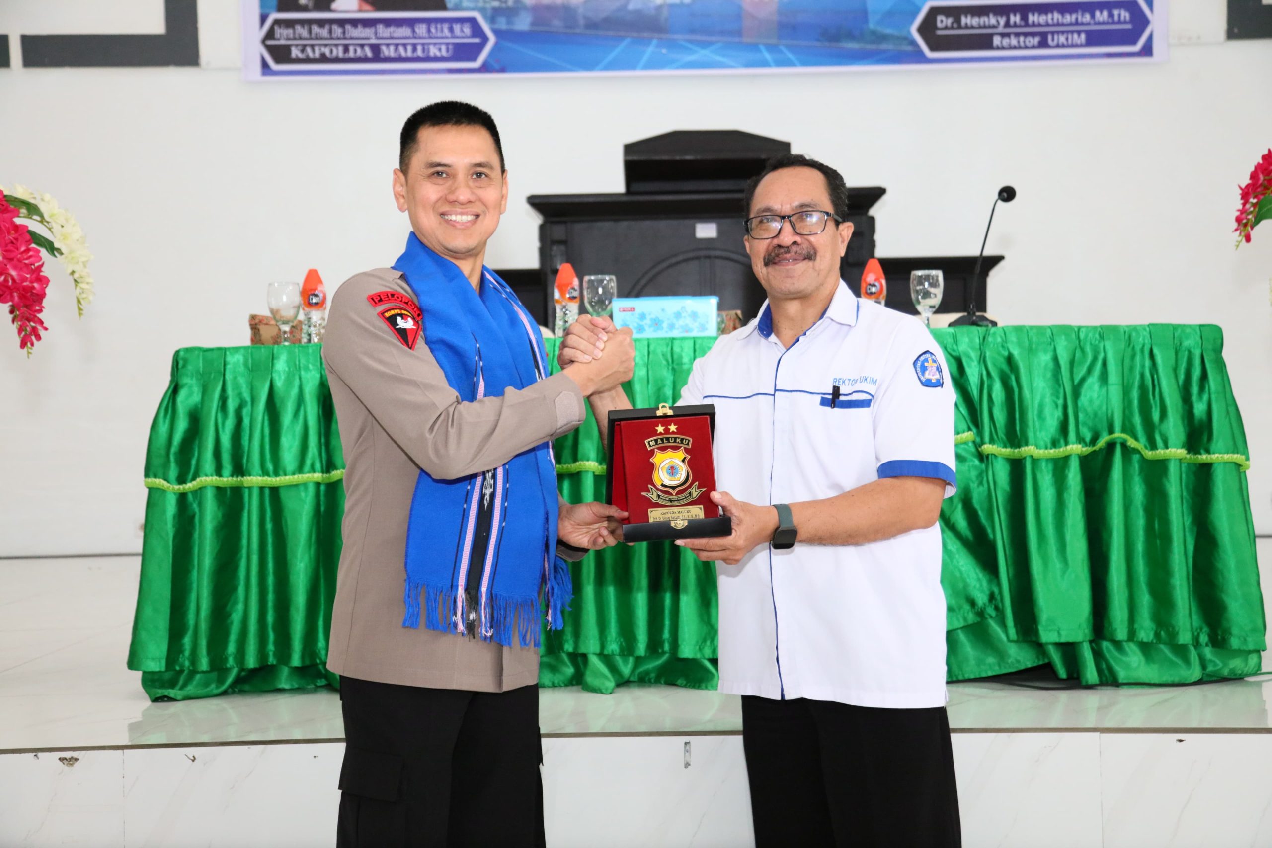 Sebagai penutup acara, dilakukan pertukaran plakat antara Kapolda Maluku dan Rektor UKIM sebagai simbol sinergitas antara institusi kepolisian dan dunia pendidikan.