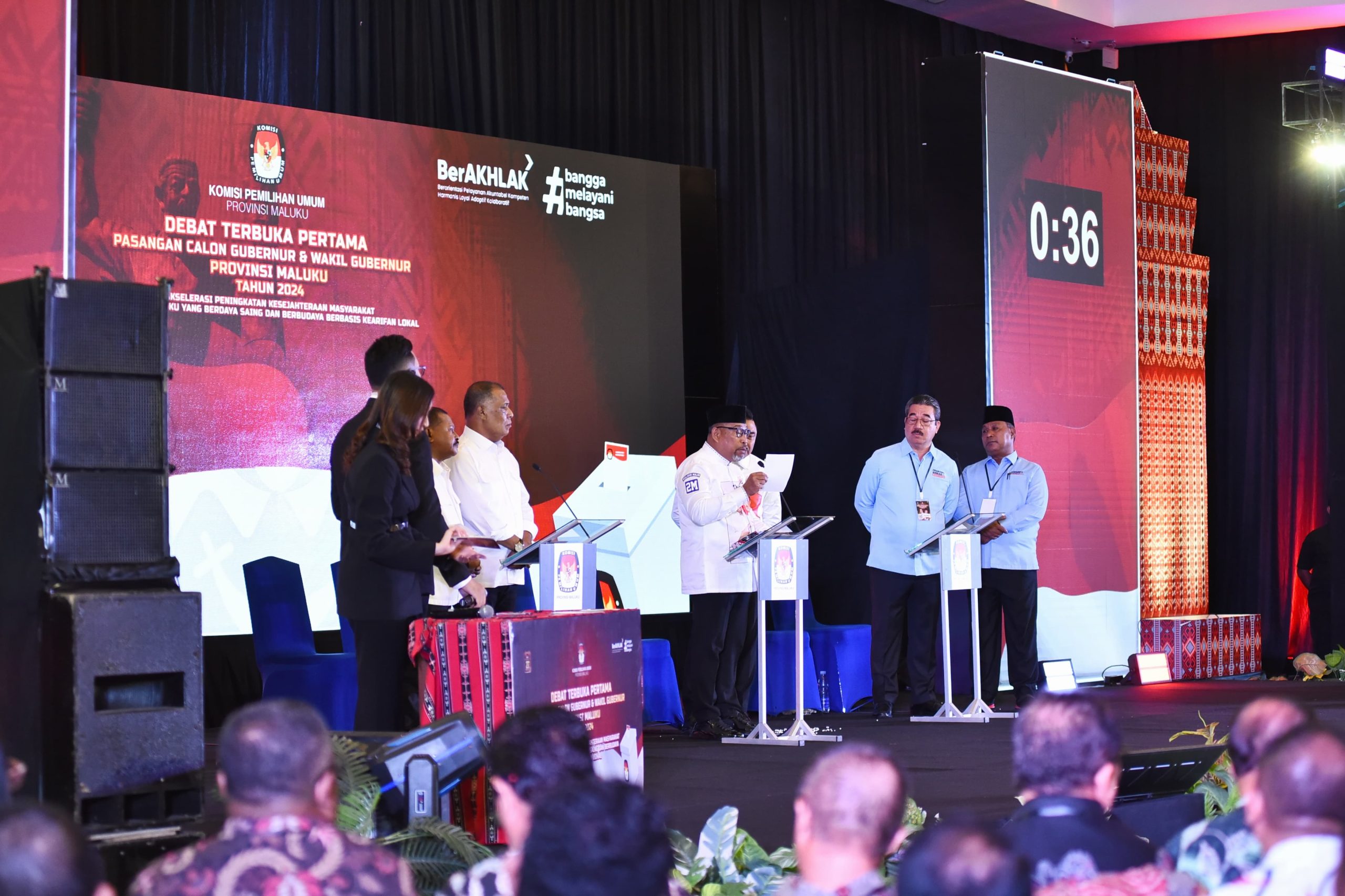 Debat terbuka pertama yang dilakukan KPU Provinsi Maluku ini berlangsung di Ballroom Natsepa Hotel, Desa Suli, Kecamatan Salahutu, Kabupaten Maluku Tengah, Sabtu (26/10/2024).