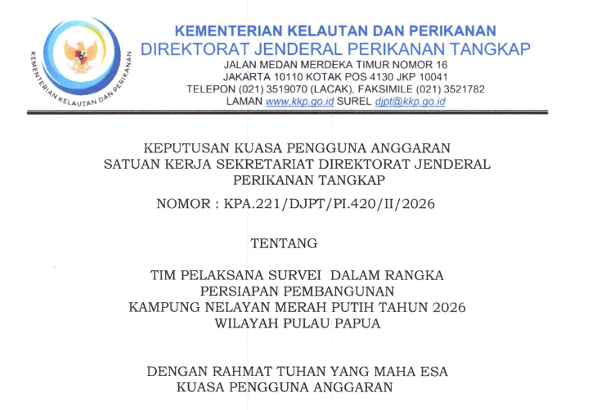Pembentukan tim tersebut tertuang dalam Keputusan Kuasa Pengguna Anggaran Satuan Kerja Sekretariat Direktorat Jenderal Perikanan Tangkap Nomor KPA.221/DJPT/PI.420/II/2026 yang ditetapkan di Jakarta pada 20 Februari 2026.