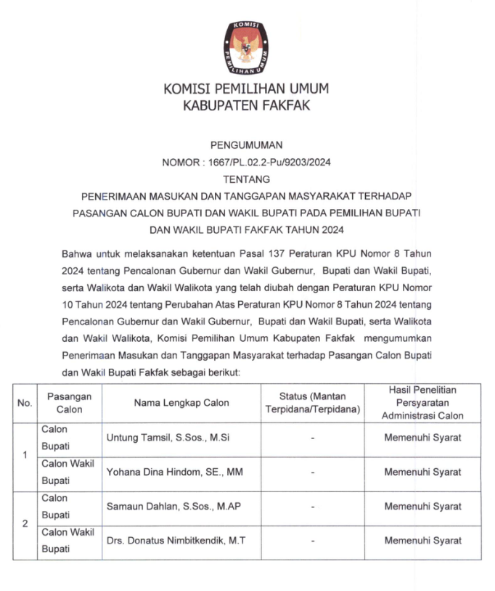 Seluruh pasangan calon dinyatakan memenuhi syarat administrasi, namun KPU Fakfak memberikan kesempatan bagi publik untuk memberikan tanggapan terkait rekam jejak, termasuk status hukum dan syarat administrasi lainnya dari para calon.
