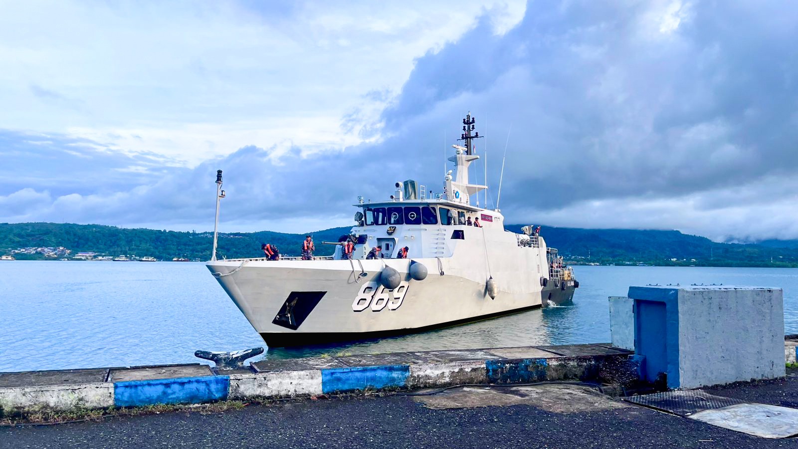 Ambon,Kabarsulsel-lndonesia.com. Unsur Satuan Kapal Patroli Kodaeral Xl, yakni KRI Gulamah-869 kembali Sandar di Dermaga Irian Kodaeral lX, Halong, Kota Ambon, Maluku disela menjalani misi Operasi Tameng Papua 2026 di bawah kendali Gugus Tempur Laut (Guspurla) Koarmada lll pada Senin pagi (9/2/2026).