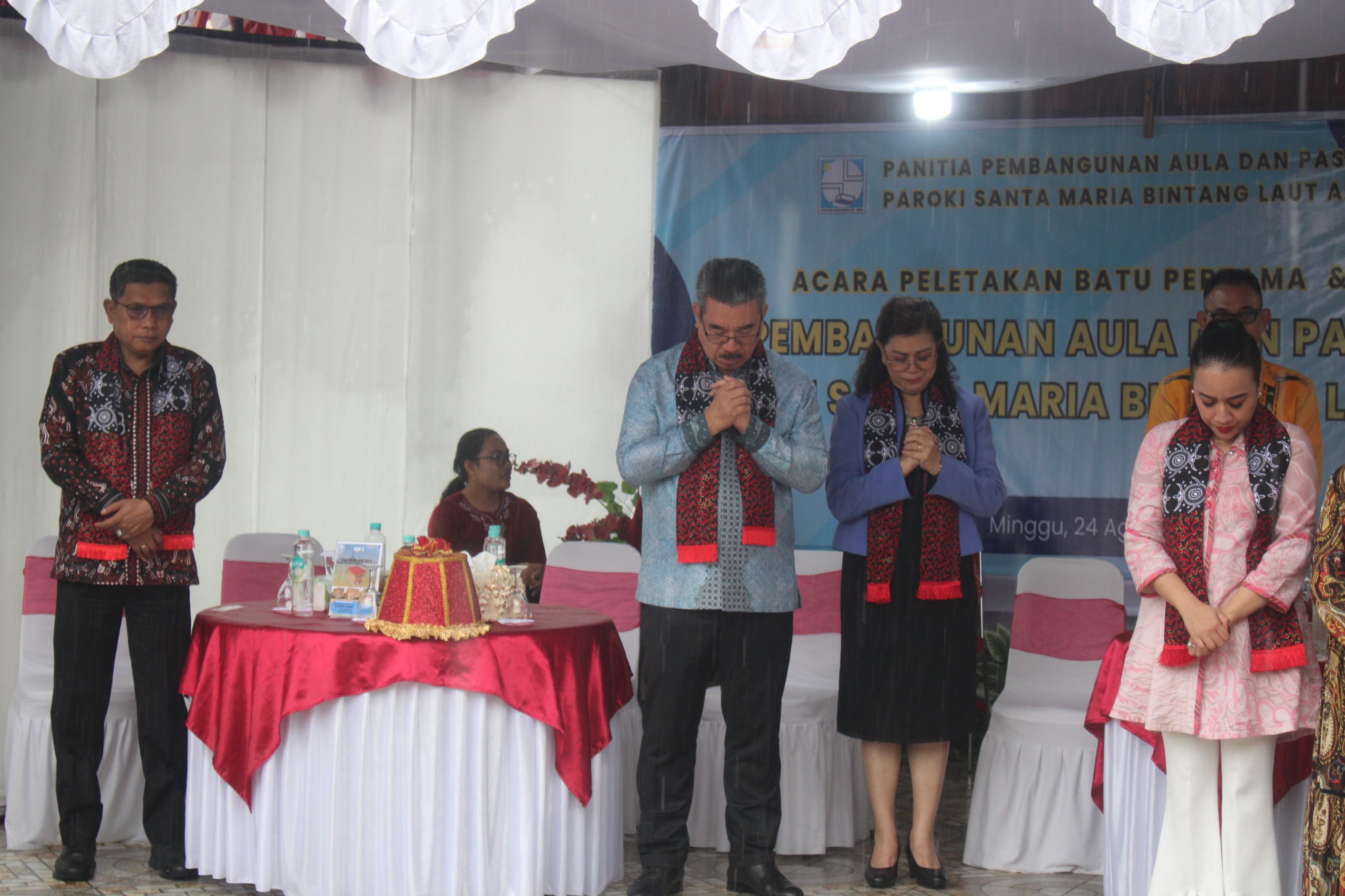 Ambon,Kabarsulsel-lndonesia.com. Gubernur Maluku Hendrik Lewerissa menghadiri Peletakan batu pertama sebagai tanda dimulainya pembangunan aula Pastoran Gereja Santa Maria Bintang Laut Soakacindan Ambon bertempat di Gereja Katolik Santa Maria Bintang Laut, Minggu (24/8/2025).