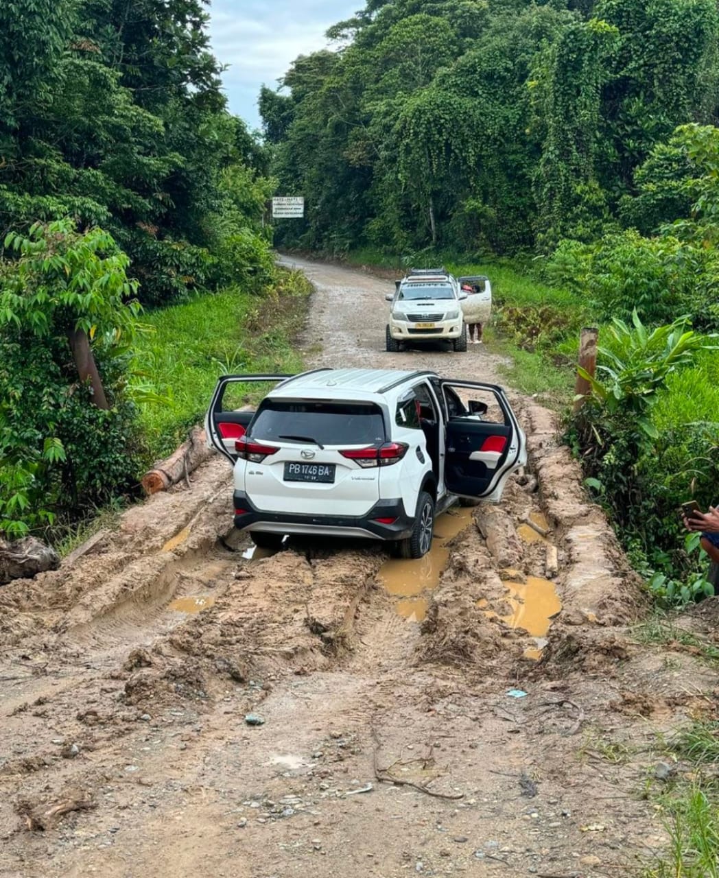 Dokumentasi dari lapangan memperlihatkan kondisi jalan yang berlumpur, licin, dan berlubang, membentang di tengah hutan belantara wilayah Moskona, Papua Barat. Jalur tanah yang sempit, diapit oleh tebing curam serta rimbunnya vegetasi liar, membuat kendaraan tim kerap tersendat. Tak jarang, kendaraan harus dibantu alat berat untuk bisa melanjutkan perjalanan. Genangan air dan lumpur pekat menjadi pemandangan sehari-hari yang menguji ketangguhan fisik, mental, dan semangat personel di lapangan.