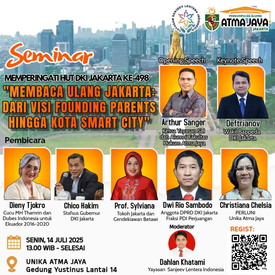 Jakarta, Kabarsulsel-Indonesia.com | Dalam rangka memperingati ulang tahun Kota Jakarta yang ke-498, Yayasan Sanjeev Lentera Indonesia bersama Perhimpunan Alumni (Perluni) Unika Atma Jaya menggelar sebuah seminar reflektif bertajuk Membaca Ulang Jakarta: Dari Visi Founding Parents Hingga Kota Smart City. Kegiatan ini dihelat pada Senin, 14 Juli 2025, di Gedung Yustinus lantai 14, Unika Atma Jaya, Jakarta.