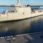 KOMANDAN LANAL SAUMLAKI SAMBUT KEDATANGAN KRI BANDA ACEH-593 DI DERMAGA LANAL SAUMLAKI