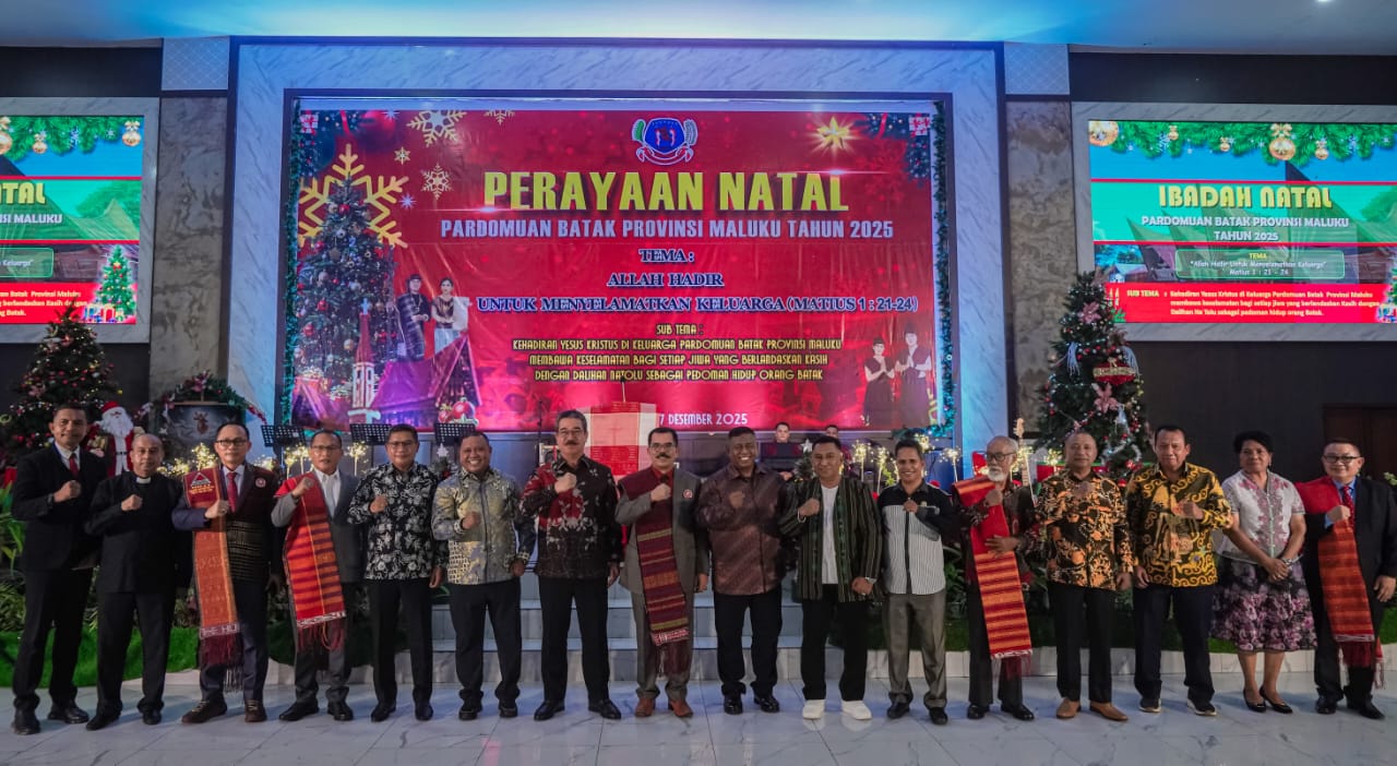 Ambon, Kabarsulsel-Indonesia.com | Keluarga Besar Persekutuan Masyarakat Batak (Pardomuan Batak) Provinsi Maluku menggelar ibadah Perayaan Natal Tahun 2025 yang berlangsung khidmat dan meriah. Acara yang mengusung tema “Allah Hadir Untuk Menyelamatkan Keluarga” ini diselenggarakan di Gedung Plaza Presisi Polda Maluku, Ambon, Minggu (7/12/2025) malam.