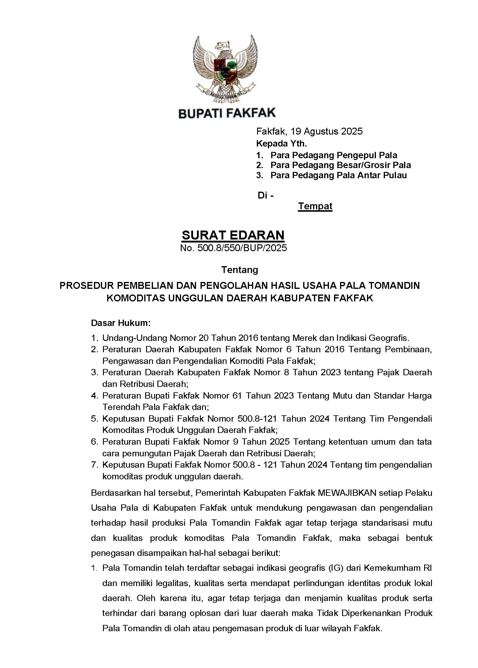 Fakfak, Kabarsulsel-Indonesia.com | Pemerintah Kabupaten Fakfak mengeluarkan surat edaran tegas terkait pengawasan mutu dan kualitas komoditas unggulan Pala Tomandin. Edaran yang ditandatangani Wakil Bupati Fakfak itu menegaskan bahwa setiap pelaku usaha pala wajib mendukung pengendalian dan standarisasi pascapanen agar reputasi dan nilai jual pala Fakfak tetap terjaga.