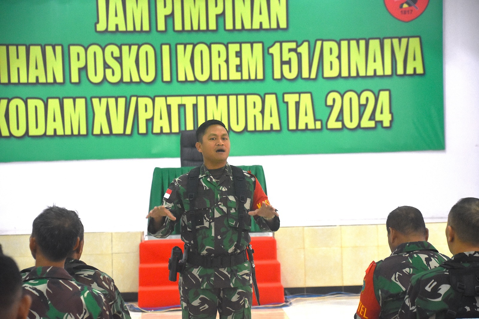 Latihan Posko I Korem 151/Binaiya dipimpin langsung oleh Danrem 151/Binaiya Brigjen TNI Antoninho Rangel Da Silva, S.IP., M.Han., di Aula Slamet Riyadi, Makorem 151/Binaiya, Batu Gajah, Kota Ambon dengan Materi latihan yang meliputi penyusunan pengembangan cara bertindak, Briefing pengembangan cara bertindak, Penyusunan analisa cara bertindak, Briefing analisa cara bertindak, penyusunan perbandingan dan pilih cara bertindak, Briefing keputusan cara bertindak, penyusunan keputusan/KUO, dan keputusan/Konsep Umum Operasional, setelah itu materi terakhir adalah mengevaluasi seluruh jalannya kegiatan.