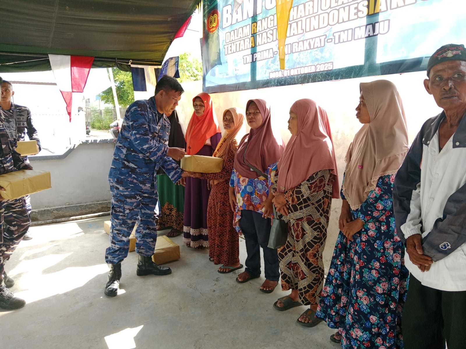 Acara bakti sosial dengan mengusung tema ” Tentara prima, Tentara Rakyat, TNI- Maju” yang berlangsung di Makotis TNI AL pada Rabu, (01/10/2025) itu di hadiri oleh Komandan Lanal Aru, Letkol Laut (P) Sriadi, S.E., M.Tr.Opsla. berserta ibu, Danramil 1503-03/Dobo Kapten Inf H. Bakri Renhoat berserakan ibu, Dankipan A Yonif 735/Nawasena, Kapten Inf Sudargo Guntoro, S.Tr.,Han berserta ibu, Danpos TNI-AU Dobo, Letda Lek Evert Kalengkongan, Para perwira lanal aru beserta ibu-ibu jalasenastri, Para anggota koramil 1503/03 Dobo berseta ibu-ibu persit, serta warga masyarakat binaan penerima bantuan sosial dan tamu undangan lainnya.