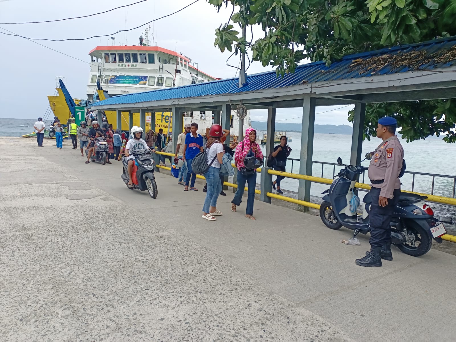 Ambon,Kabarsulsel-lndonesia.com. Personel Direktorat Polairud Polda Maluku dan Satpolair Polresta Ambon bersama Polsek Salahutu, mengamankan arus balik lebaran Idul Fitri 1446 Hijriah di Dermaga Pelabuhan Hunimua, Liang, Kecamatan Salahutu, Kabupaten Maluku Tengah, Rabu (2/4/2025).