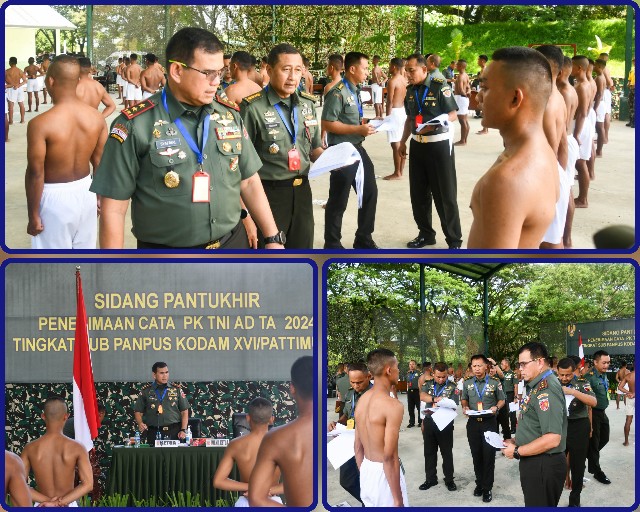 Ambon, Kabarsulsel-Indonesia.com | Pangdam XVI/Pattimura, Mayjen TNI Syafrial, PSC., M.Tr.(Han)., memimpin sidang Pantukhir penerimaan Cata PK TNI AD gelombang pertama TA. 2024 tingkat Sub Panpus Kodam XVI/Pattimura di Rindam XVI/Pattimura, desa Suli, Kecamatan Salahutu, Kabupaten Maluku Tengah, Selasa (30/4/2024).