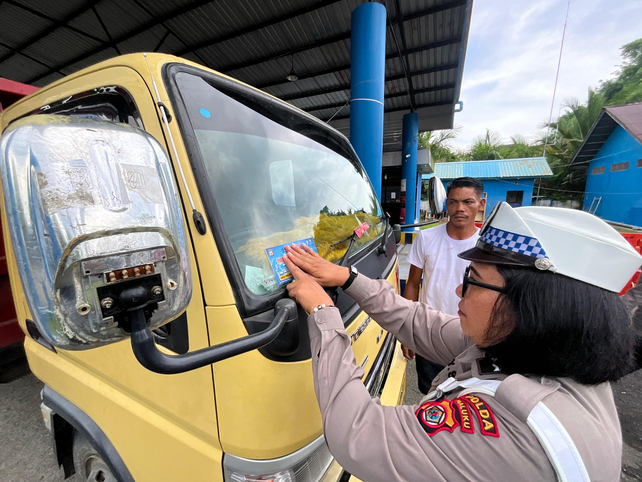 Tak hanya memberikan peringatan verbal, petugas turut menempelkan stiker imbauan tertib berlalu lintas pada setiap kendaraan pengangkut barang yang diperiksa.