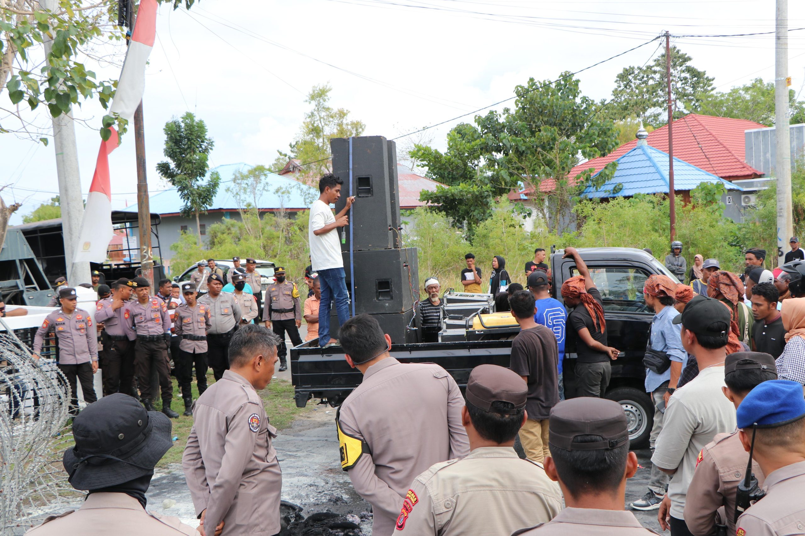 Melihat reaksi masa unjuk rasa mulai anarkis aparat kepolisian polres Buru mencoba untuk menenakan aksi masa untuk tidak anarkis dan selalu tenang,akan tetapi masa aksi tidak mengindahkan himbauaan dan terus membabi buta menyerang anggota kepolsian