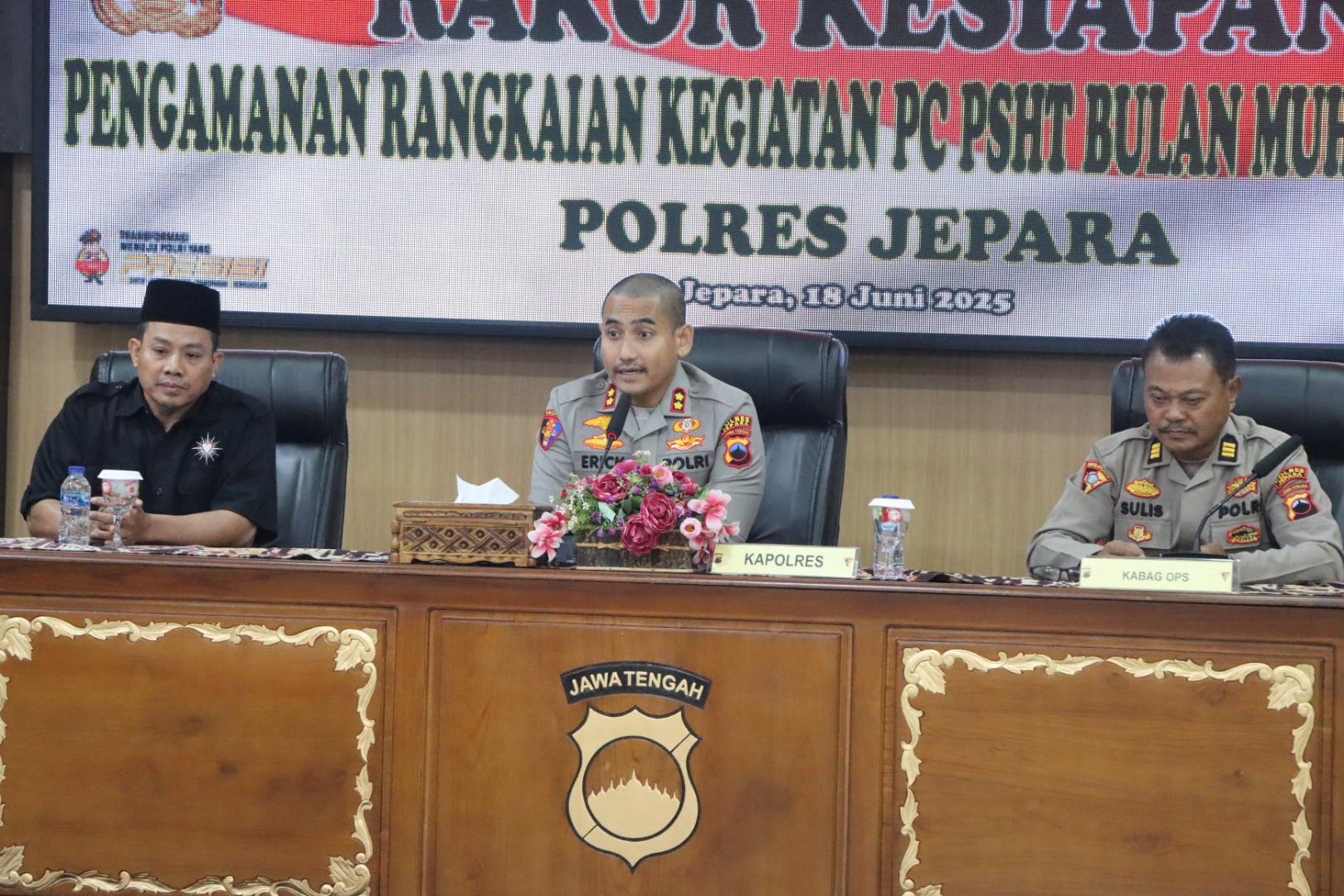 Dalam kegiatan tersebut dipimpin langsung oleh Kapolres Jepara AKBP Erick Budi Santoso, dengan dihadiri pejabat utama dan personel Polres Jepara, Kapolsek Jajaran, Ketua PSHT, perwakilan Kodim 0719/Jepara, Satpol PP, Disparbud, Dinkes dan undangan lainnya.