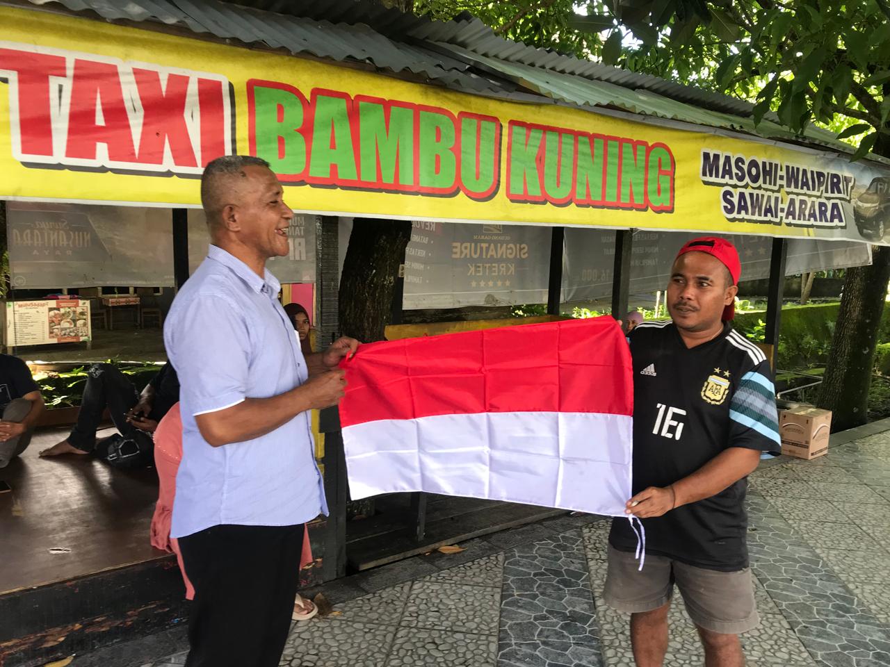 Pembagian bendera merah putih kepada masyarakat menjelang peringatan Hari Kemerdekaan RI ke-80 Tahun berlangsung di tiga lokasi, seperti di Terminal Binaya Masohi, Pangkalan Taxi Bambu Kuning, dan Pemukiman masyarakat Kelurahan Namasina.