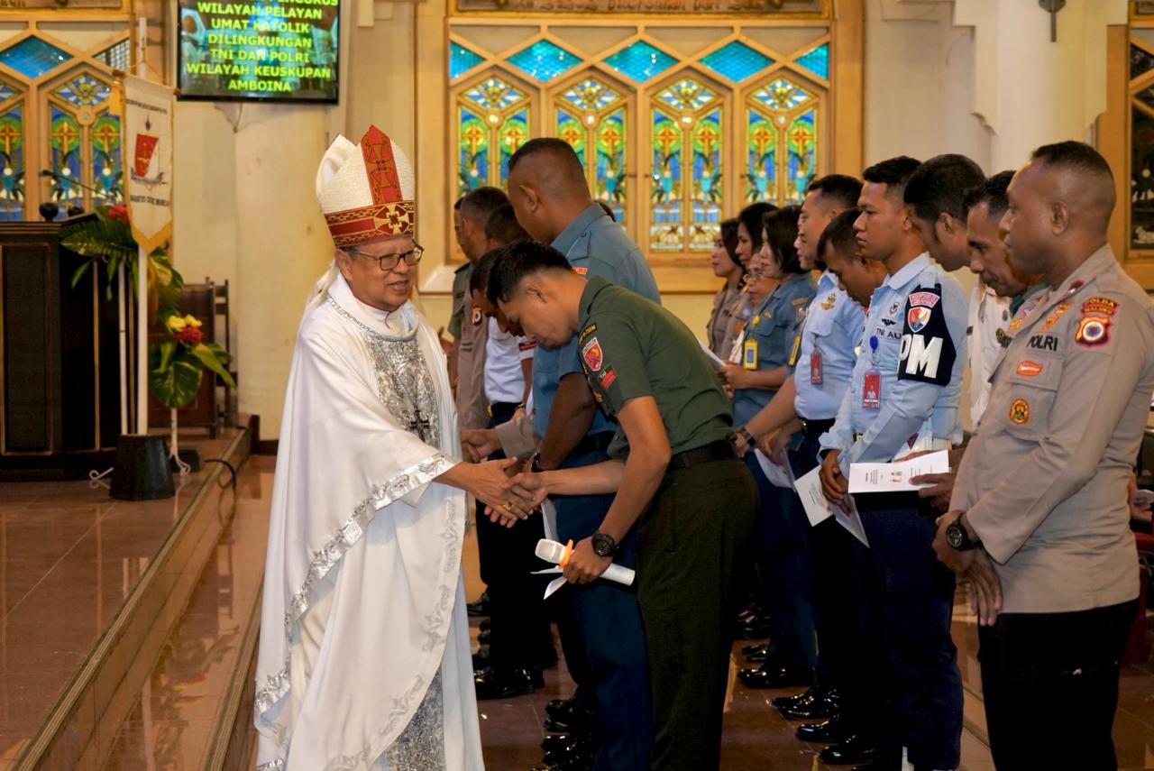 Ambon.Kabarsulsel.Indonesia.Com.Perayaan Misa Ekaristi dan pelantikan pengurus baru Ordinariatus Castrensis Indonesia (OCI) dengan selebran utama Mgr. Ignatius Kardinal Suharyo (Uskup OCI atau Umat Katolik Lingkungan TNI dan POLRI) didampingi konselebran Mgr. Seno Ngutra (Uskup Keuskupan Amboina), berlangsung di Katedral Santo Fransiskus Xaverius Jl. Pattimura, Uritetu, Kec. Sirimau, Maluku, Rabu, (14/8/2024).