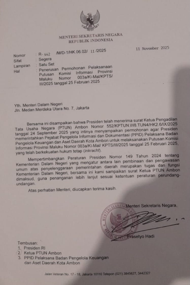 Surat Menteri Sekretaris Negara tersebut turut ditembuskan kepada Presiden RI, Ketua PTUN Ambon, serta PPID Pelaksana Badan Pengelola Keuangan dan Aset Daerah Kota Ambon.