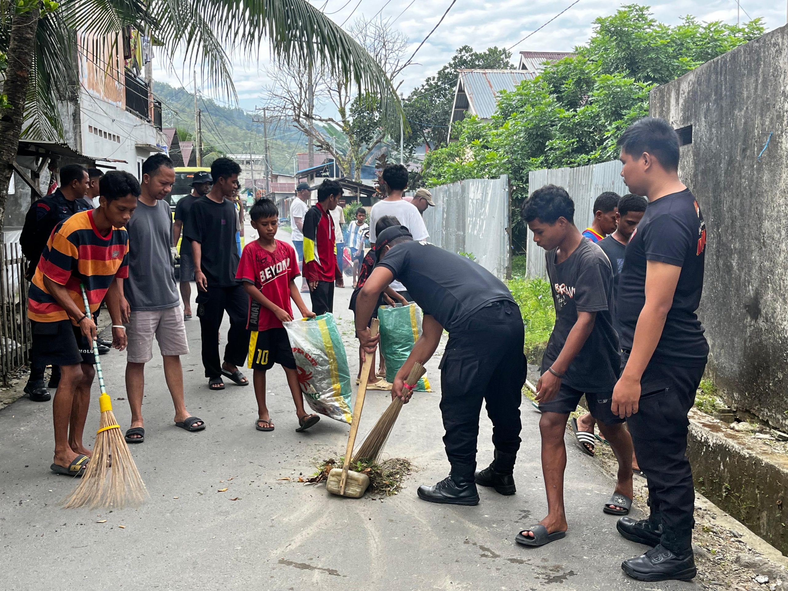 Ambon,Kabarsulsel-lndonesia.com. Menjelang Bulan Suci Ramadhan, personel Satuan Brimob Polda Maluku yang bertugas di Pos Pengamanan (Pos Pam) Jembatan Amalatu menggelar kegiatan kerja bakti bersama masyarakat di sekitar Masjid Nurul Izzah, Kompleks Jembatan Amalatu, kawasan UIN A.M. Sangadji Negeri Batu Merah, Kecamatan Sirimau, Kota Ambon.