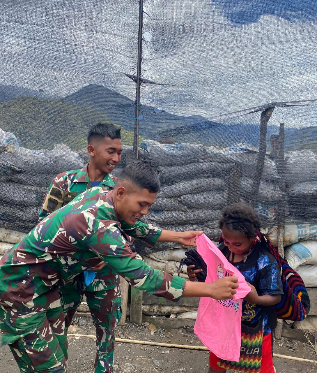 Pembagian pakaian dilakukan secara langsung kepada masyarakat yang melintas di sekitar pos titik kuat. Warga yang kebetulan berada di sekitar lokasi terlihat gembira menerima pakaian yang disediakan oleh Satgas. Pakaian-pakaian tersebut merupakan hasil pengumpulan dari personel Satgas dan juga donasi dari berbagai pihak yang peduli terhadap kondisi masyarakat di wilayah tersebut.