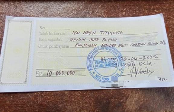 perlu di ketahui pula bahwa, Kwitansi sebagai bukti tanda terima yang dilakukan kedua belah pihak itu ditandatangani oleh mantan pejabat kepala desa Alusi Tamrian Kostantinus Labatar pada tanggal 20-04-2022 dengan jaminan bunga sebesar 30% sekaligus di bubuhi tanda tangan serta cap pemdes Alusi Tamrian.