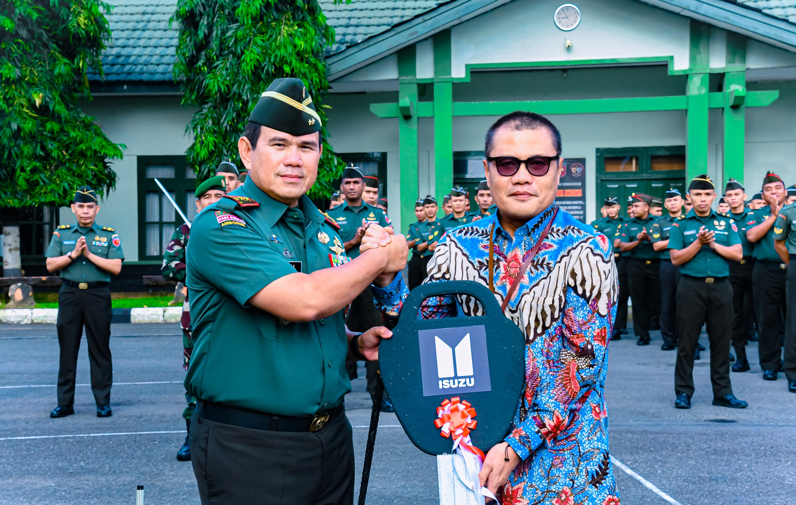 Penyerahan kunci secara simbolik dari Pimpinan BRI wilayah Makassar Bapak Dian Islami kepada Pangdam XV/Pattimura Mayjen TNI Syafrial, PSC., M.Tr.(Han)., yang dilanjutkan dengan penandatanganan berita acara penyerahan bantuan, sebagai tanda resmi serah terima kendaraan tersebut.