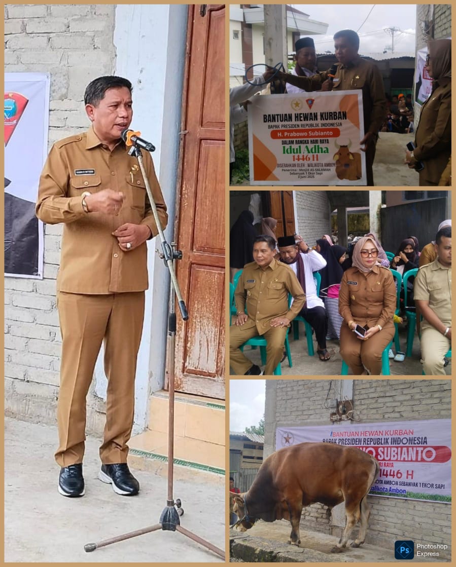Dalam rangkaian itu, kami bersyukur bahwa Bapak Presiden RI, Hj Prabowo Subianto berkenan memberikan bantuan hewan kurban1 ekor sapi kepada masyarakat kota Ambon lewat Pemerintah kota yang kami serahkan kepada Masjid Assalamah Airsalobar kecamatan Nusaniwe, ungkap Walikota.