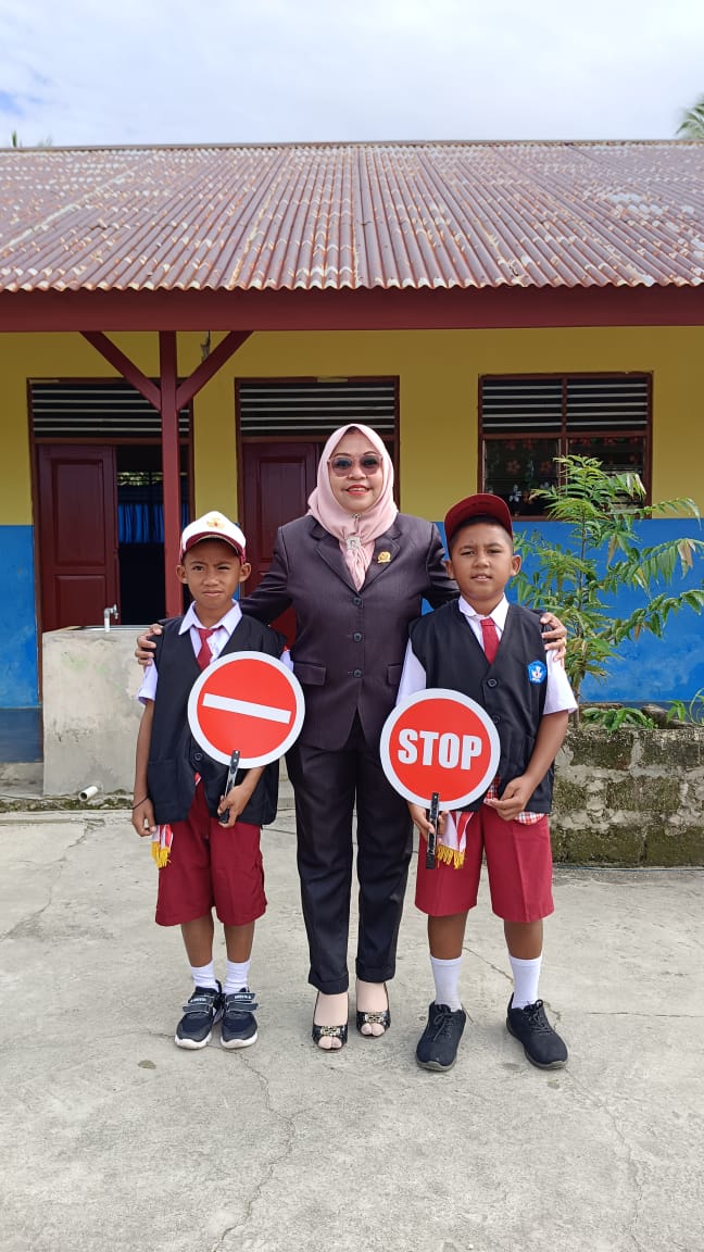 Tak hanya datang memberi motivasi, Yoan juga menyerahkan bantuan berupa papan tulis whiteboard dan rambu lalu lintas “STOP”.